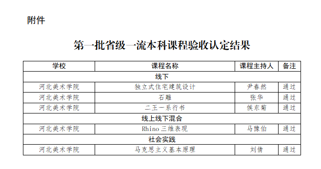 近日,河北省教育厅发布《关于公布第一批省级一流本科课程验收认定结果的通知》(冀教高函〔2026〕12号),河北美术学院《独立式住宅建筑设计》《石雕》《二王一系行书》《Rhino三维表现》《马克思主义基本原理》五门课程顺利通过验收,被认定为省级一流本科课程,标志着学校在课程建设、教育教学改革与人才培养质量提升方面再获新突破。《二王一系行书》是书法学专业主干课程,课程以...