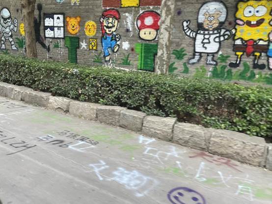 在墙面的绘制间隙,路过或驻足的部分同学产生了一些不文明行为,比如乱扔垃圾、墙面与地面乱涂乱画等。不管是一时无心,还是刻意为之,只要这些行为存在,就弄脏了风景、破坏了风貌、玷污了文明。