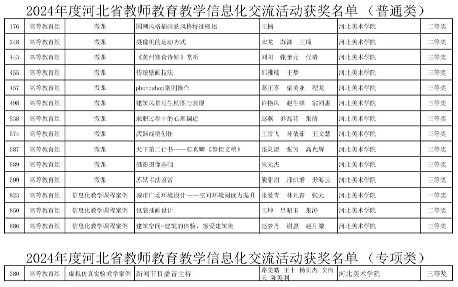 近日,河北省教育厅公布2024年度河北省教师教育教学信息化交流活动评选结果,我校共15项作品获奖。其中,一等奖1项、二等奖3项、三等奖11项,张曼青、林凡青、张元团队参赛作品被推荐参加国赛。