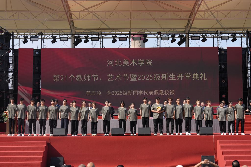 张建敏宣读《河北美术学院关于表彰2024—2025学年优秀科研创作成果的决定》。与会校领导为新生代表佩戴校徽。