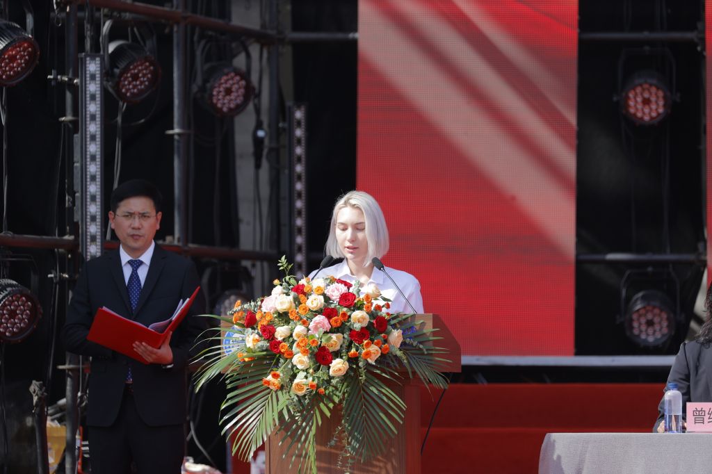 设计学院张程伟作为新生代表、于伟冉作为研究生代表、来自俄罗斯的拉纳作为留学生代表,感恩相遇,誓以校训为帆,融技术与艺术,携同窗在河美勇敢追梦、共书无悔青春。
