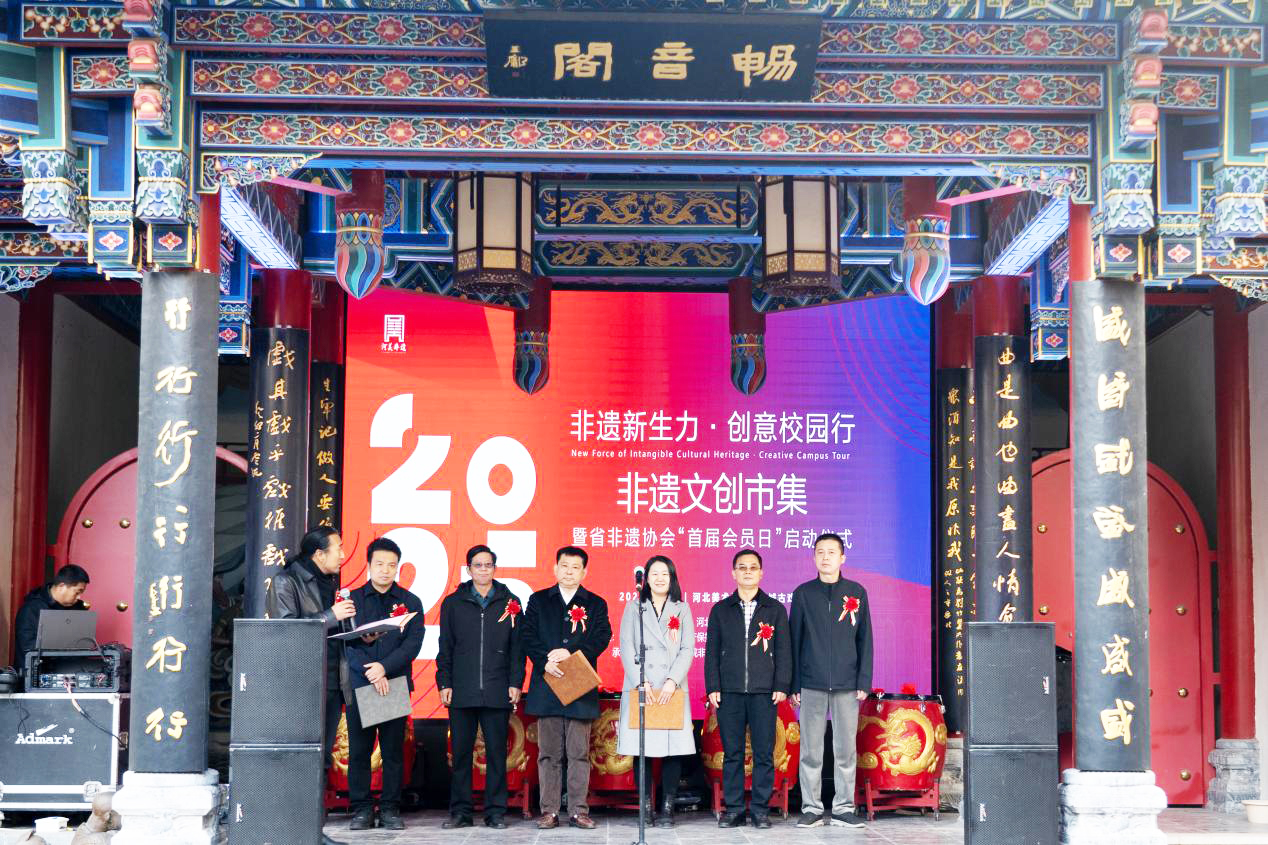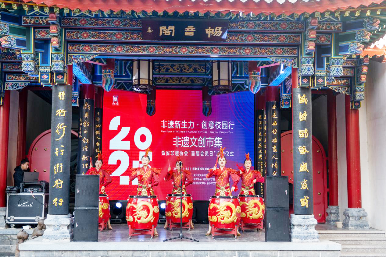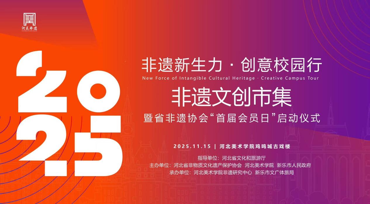 2025年11月15日,由河北省文化和旅游厅指导,河北省非物质文化遗产保护协会、河北美术学院、新乐市人民政府联合主办,河北美术学院非物质文化遗产研究中心、新乐市文广体旅局联合承办的2025年“非遗新生力·创意校园行”非遗文创市集暨河北省非遗保护协会“首届会员日”活动,在河北美术学院鸡鸣城(非遗城)正式启动。