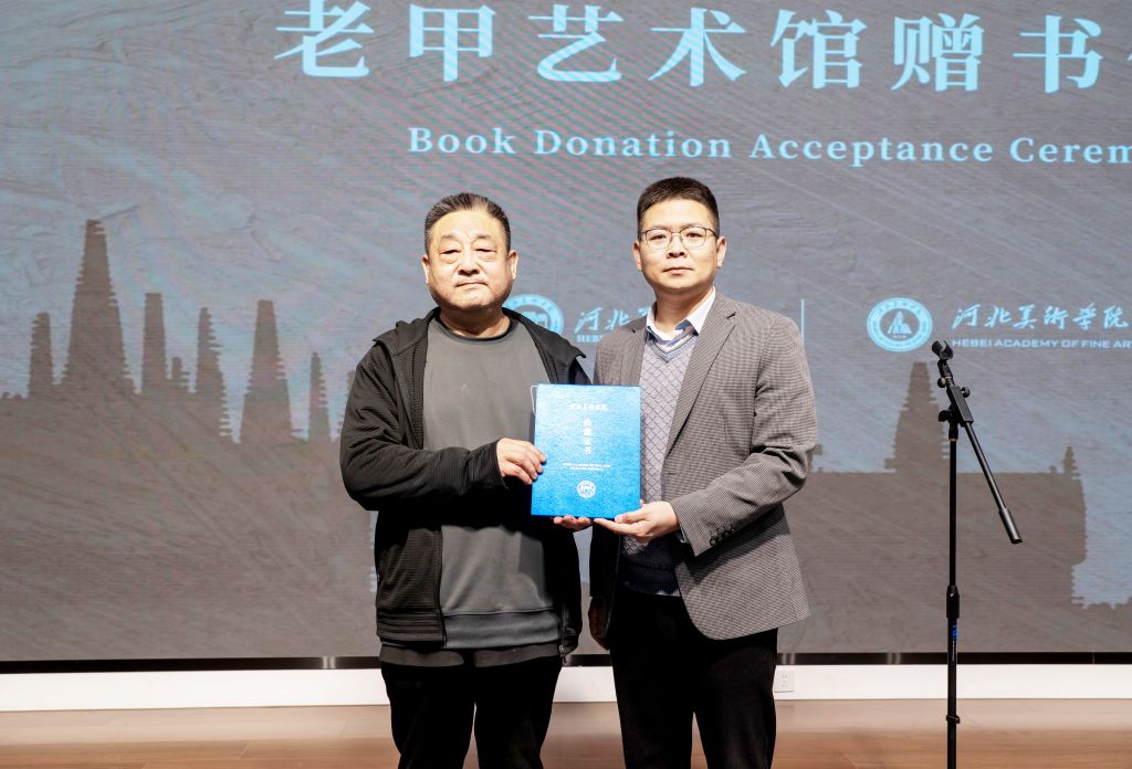 贠冬鸣结合自己四十余年来对老甲先生大写意这一中国绘画的探究,扼要概述了先生的艺术精髓及其体系成因,并就写意精神与艺术史的关系分享了学术见解。随后,他代表老甲艺术馆向我校捐赠了多部珍贵文献史料,包括《老甲大写意》(八卷本)、《老甲大写意作品集》《老甲艺术文献丛书·老甲艺术随笔》,以及本人著述《洞鉴——河北历代美术家》《标志——新中国河北美术文献》《保定美术二千年》《田辛甫和他的时代》。李世新向贠冬鸣颁发捐赠证书。