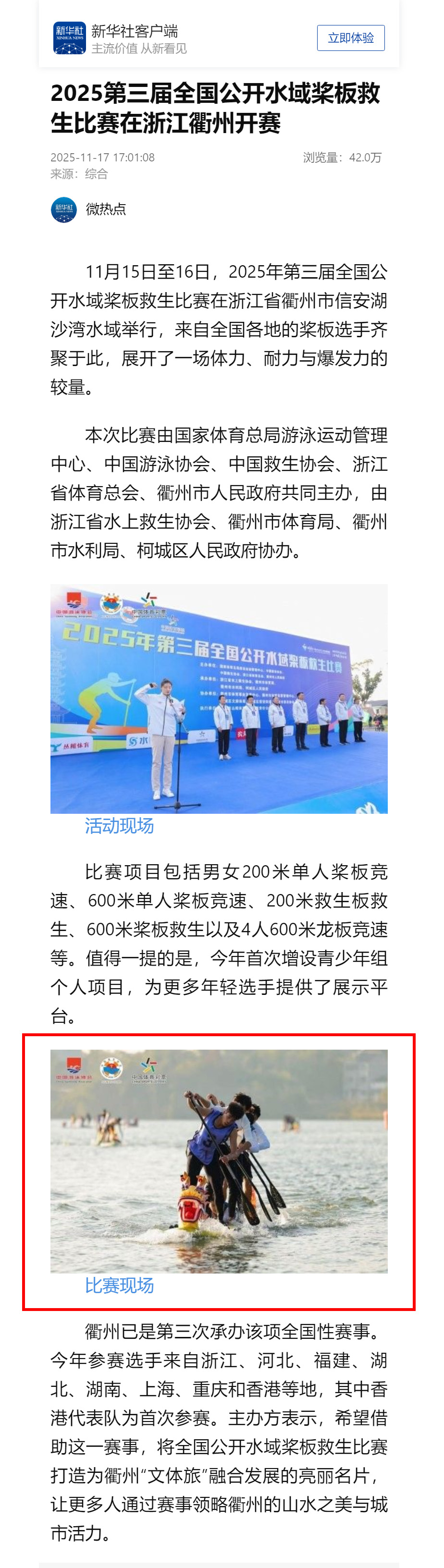 11月17日,新华社发布《2025第三届全国公开水域桨板救生赛在浙江衢州开赛》,报道配图定格我校水上运动队征战瞬间——这是我校首次亮相该国家级赛事,浏览量已超41万。