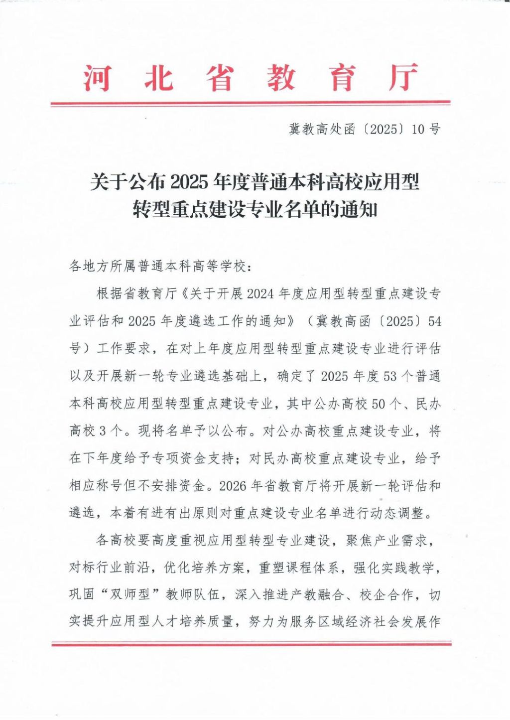 本次评选根据省教育厅依据《2024年度应用型转型重点建设专业评估和2025年度遴选工作的通知》(教高函〔2025〕54号)工作要求,在对上年度应用型转型重点建设专业进行评估以及开展新一轮专业遴选基础上,确定了2025年度53个普通本科高校应用型转型重点建设专业,其中公办高校50个、民办高校3个。
