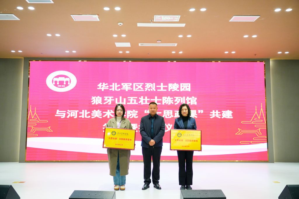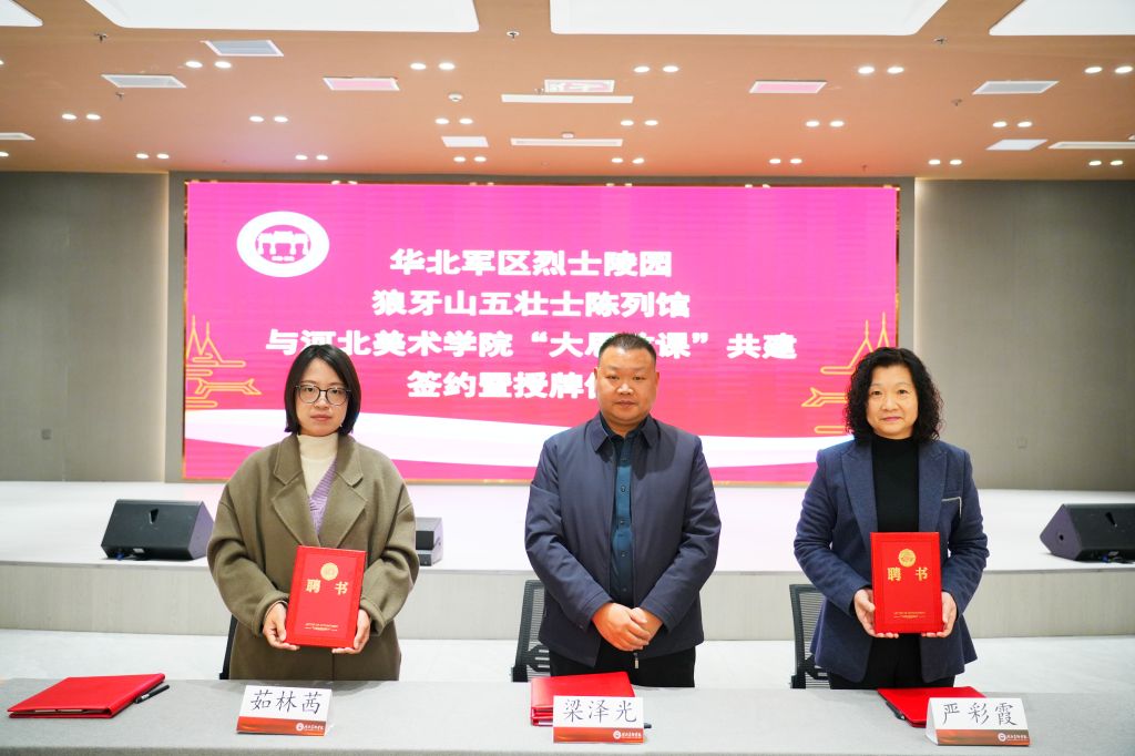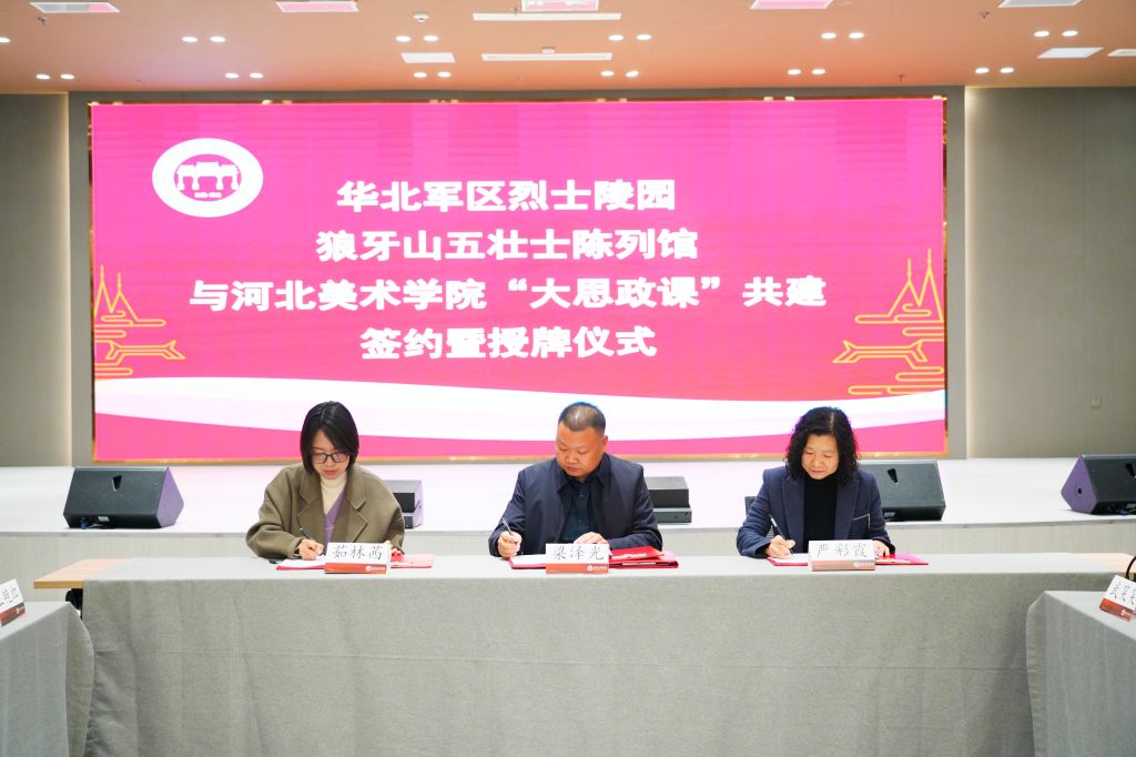 为深入贯彻落实习近平总书记关于“大思政课”的重要指示批示精神,充分激活红色资源育人效能,推动思政教育与实践育人深度融合,11月26日,河北美术学院与华北军区烈士陵园、狼牙山五壮士陈列馆共建“大思政课”实践教学基地签约暨授牌仪式在学校举行。华北军区烈士陵园党委副书记严彩霞、党办室主任王艳红、宣传教育科副科长赵芳婷,狼牙山景区管委会宣传科科长茹林茜、景区市场负责人李红雨,河北美术学院马克思主义学院执行院长梁泽光、党总支书记武笑笑及教师代表参加仪式,见证校馆协同育人新起点。