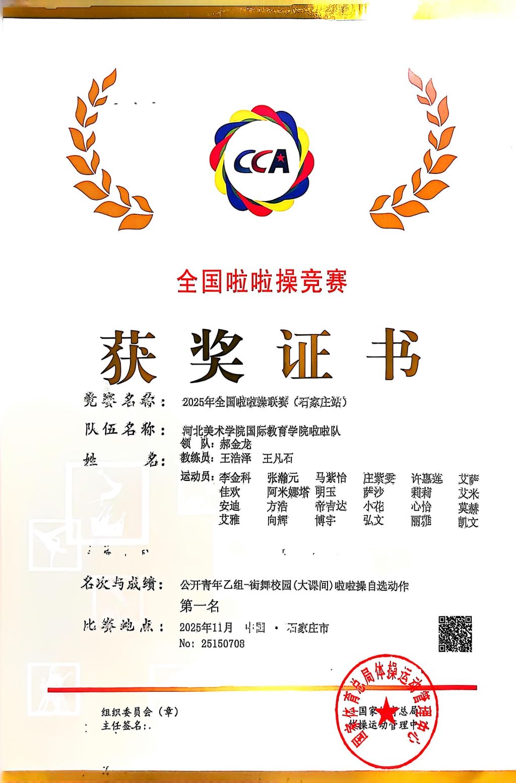 11月29日,2025年全国啦啦操联赛(石家庄站)在石家庄国际博览中心圆满落幕。我校啦啦操队在公开青年乙组——街舞校园(大课间)啦啦操自选动作项目中勇夺第一名,用动感舞姿书写跨文化青春篇章。