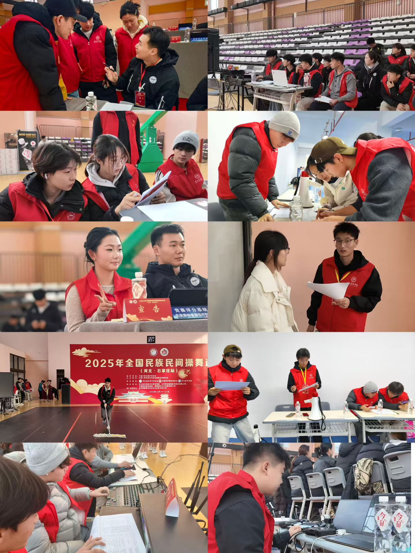 12月20日,2025年全国民族民间操舞运动会(河北·石家庄站)在我校北区体育馆燃情启幕。作为承办单位,学校不仅为来自全国的43支队伍、近700名运动员提供了专业竞赛平台,更组织120余名学生深度参与赛事全程服务,将课堂所学融入实践,在志愿服务中锤炼专业能力,生动诠释了“以赛促学、实践育人”的教育理念。