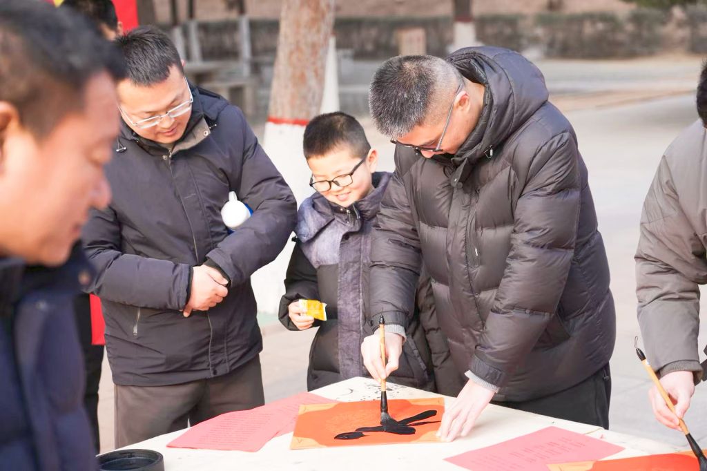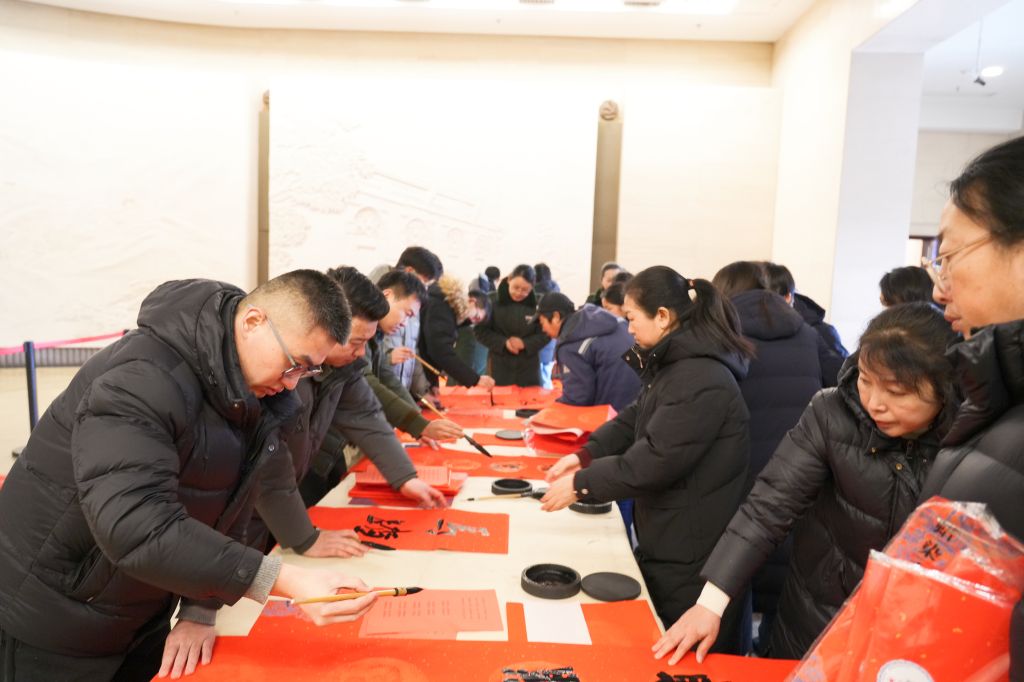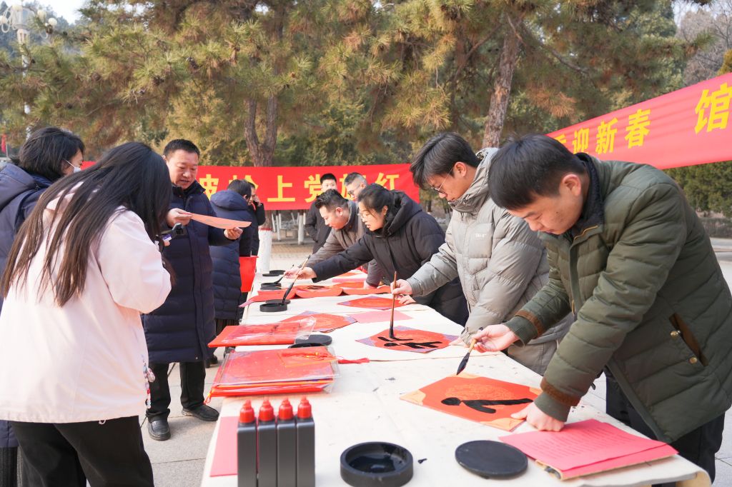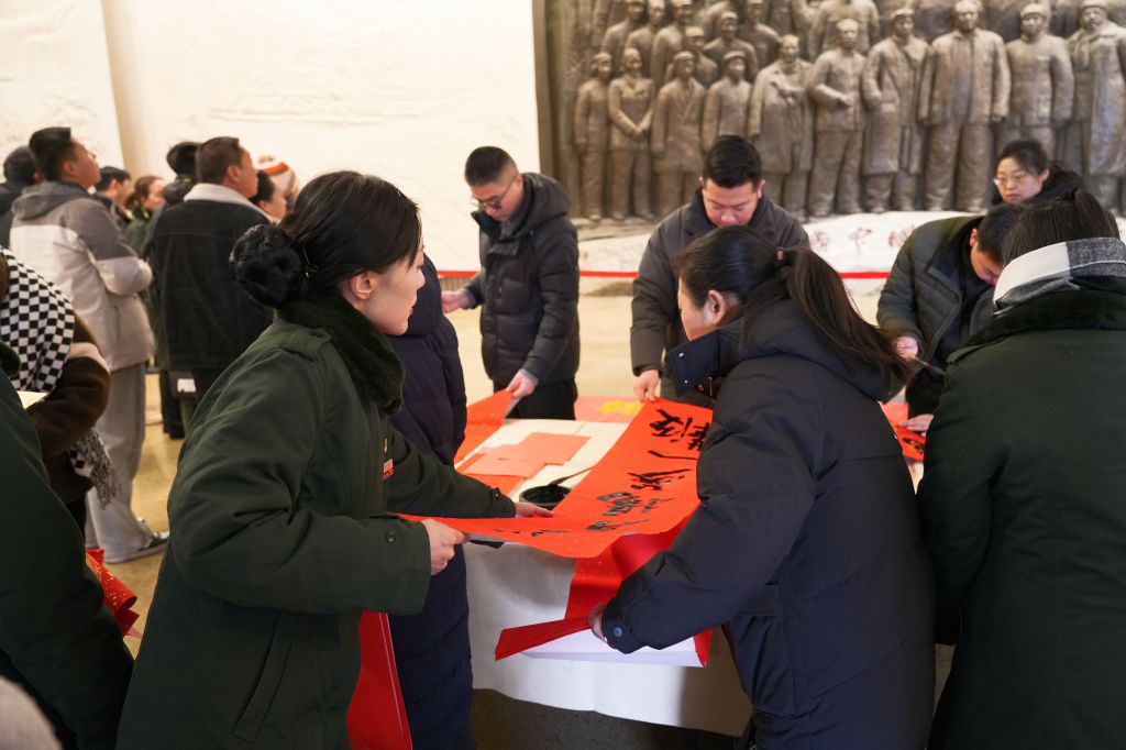 活动现场墨香洋溢,老师们专注挥毫,将红色情怀倾注笔端。篆、隶、楷、行各具特色,线条流畅、结构和谐,一幅幅春联和“福”字墨韵生动、寓意美好。老师们将作品赠予纪念馆工作人员与参观游客,红联墨香中寄托了对革命圣地的敬意。