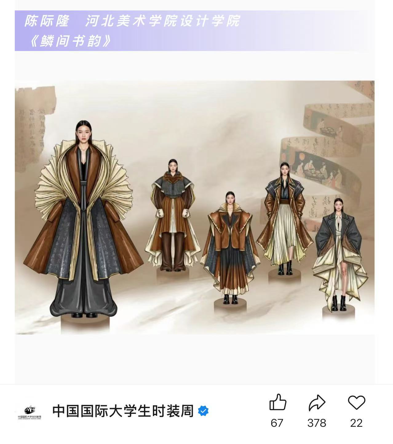 本次入围不仅是对陈际隆同学个人设计能力的认可,更彰显了河北美术学院在服装设计专业教育领域的扎实成果。作为培育服装设计新人的重要阵地,我们将传统工艺与现代设计、趋势洞察与市场逻辑相结合,为学生搭建了从创意到落地的完整培养体系。未来,我们将持续深耕服装与服饰设计专业发展及教学改革,为社会培养更多优秀的服装设计人才。