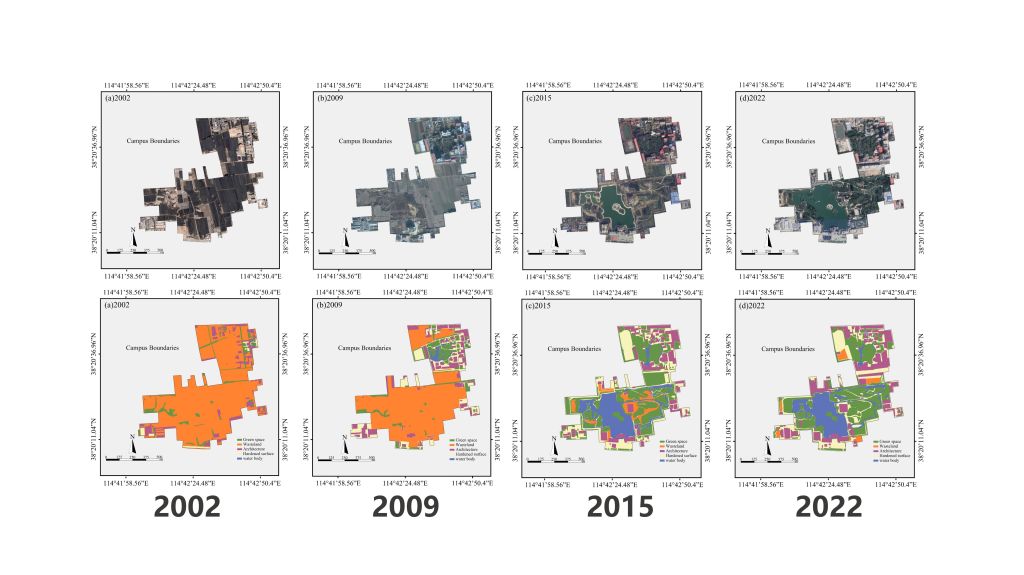 在理论建构与研究层面,设计学院董小龙、陈利伟、高洋等多位骨干教师组成研究团队,围绕校园土地利用优化与生态重构开展系统研究,基于20年校园建设实践的持续积累,系统整合多时相高分辨率卫星遥感影像与相关空间数据,通过梳理与分析校园土地利用的长期变化过程,科学揭示河北美术学院校园土地利用的动态演化特征,为校园建设策略的持续优化与更新提供了可靠的数据支撑与方法依据。由此,校园建设路径逐步由早期“以用为先”的空间拓展,转向“以生态为底、以文化为魂”的整体更新模式,构建了以文化、空间与生态协同为核心的多级再生机制,形成了具有连续性、系统性与示范意义的校园发展范例。