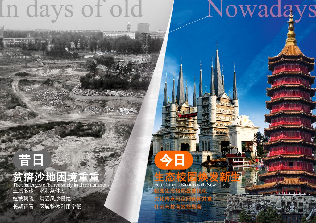 河北美术学院自2002年建校以来,校长甄忠义、执行校长甄墨作为校园整体建设策划者与决策者,后勤管理与服务处处长甄新朋等团队协同推进实施落地。校园建设初期,用地多为荒废沙坑地与盐碱地,土壤贫瘠、生态基础薄弱,植被覆盖极低,整体环境条件较为严苛。在冀西沙荒地与低效利用地的现实背景下,学校持续推进校园空间结构、功能体系与生态环境的系统塑造,使校园建设逐步完成了从基础空间营建、功能体系完善,到以生态修复为基础、以文化表达为内核的高质量协同发展的阶段性转变。