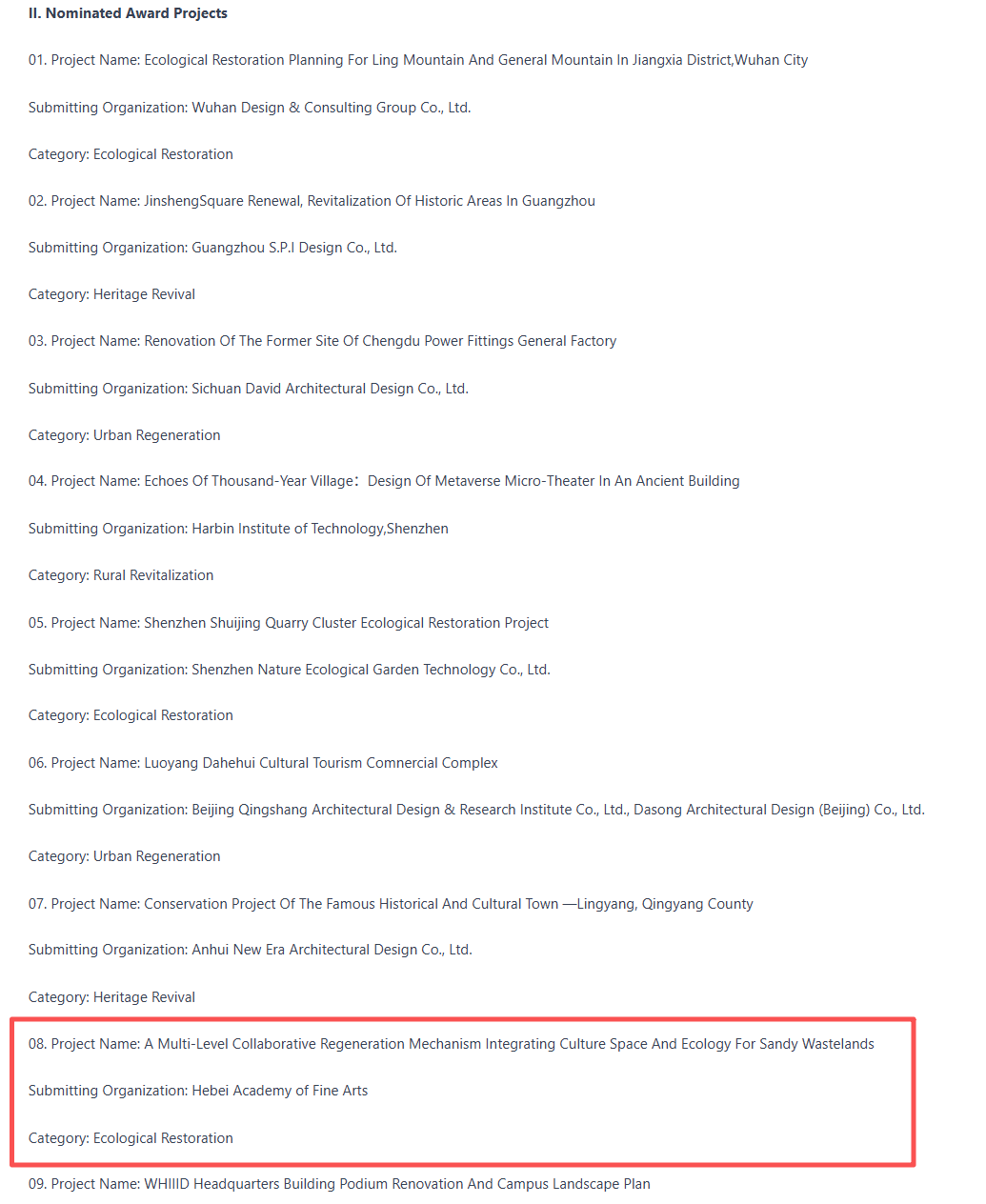 根据国际自然资源学会(iAONR)2026年2月2日官方发布的初评结果公告(中国区),本届评审工作由国际自然资源学会(iAONR)理事会成员牵头,在国际统一评审标准下组织实施,联合Global Designers Association相关代表及评审团专家共同完成。中国区入围项目单位主要为北京大学土地规划与设计研究所、天津大学、哈尔滨工业大学、北京工业大学、河北美术学院、中国建筑设计研究集团、深圳城市规划与土地资源研究中心等高校团队以及一线建筑规划设计院,评审通过通讯评审与综合评分相结合的方式,从多维度进行系统遴选,最终形成提名项目名单并予以公示。