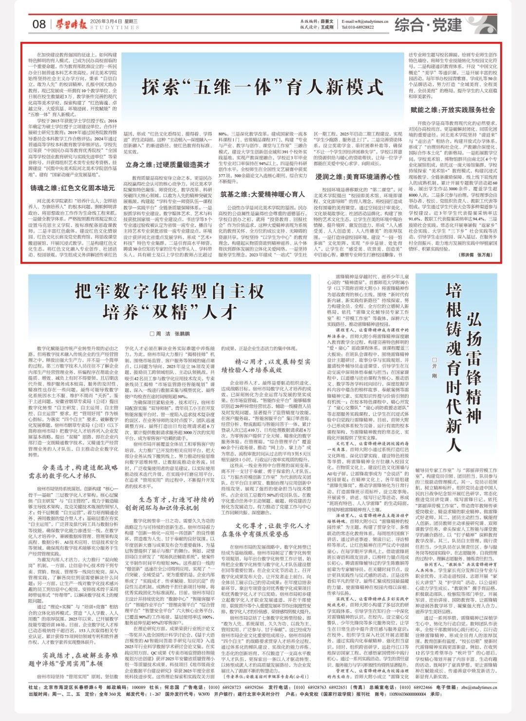 3月4日,中共中央党校主管主办的《学习时报》在第8版显著位置,以《探索“五维一体”育人新模式》为题,深度报道了我校在加快建设教育强国背景下,扎根中国大地办教育,构建并实践“红色铸魂、卓越立身、大爱筑基、环境浸润、开放赋能”“五维一体”育人新模式的探索历程与显著成效。