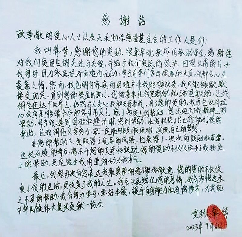 2024年退役复学后,张景杰成为我校设计学院2024级学生,他将军人情怀延续到校园与社会:一年14次无偿献血,累计献血5200毫升;在边疆服役期间便从微薄津贴中默默资助困难学生,收到受助学生的真挚感谢信;日常生活中,义务植树、帮同学搬重物、扶起倒地共享单车……在每一个“能做点什么”的瞬间,他总是最先行动的。