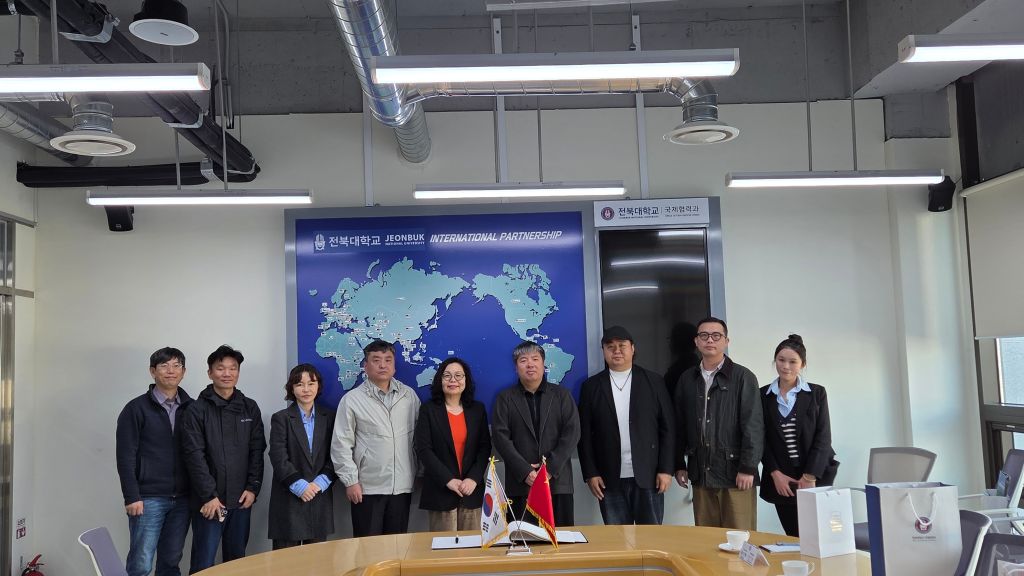 4月8日,代表团到访全北国立大学。该校作为韩国国立旗舰大学之一,其艺术类专业在传统与现代融合方面成果突出。全北国立大学副校长赵花林、老师金印苏、老师全春梅出席会谈。双方就校级领导互访机制、交换生学习项目、夏令营联合组织以及艺术展览合作等进行全面交流。我校提出定期举办两校作品联展的倡议,得到韩方积极响应。双方约定尽快细化国际交换生派遣方案,并推动年内启动首次校级互访与师生作品交流展。