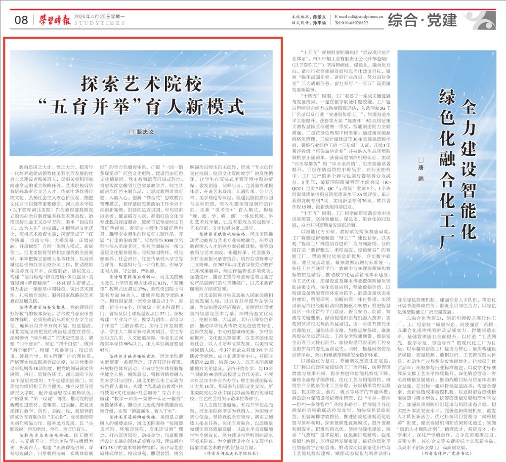 4月20日,中共中央党校主管主办的《学习时报》在第8版“综合•党建”栏目,刊发了我校校长甄忠义的署名文章《探索艺术院校“五育并举”育人新模式》。文章系统介绍了我校构建“德育铸魂+智育提质+体育强身+美育浸润+劳育赋能”一体化育人新模式的探索成果。该报道被新华社转载。