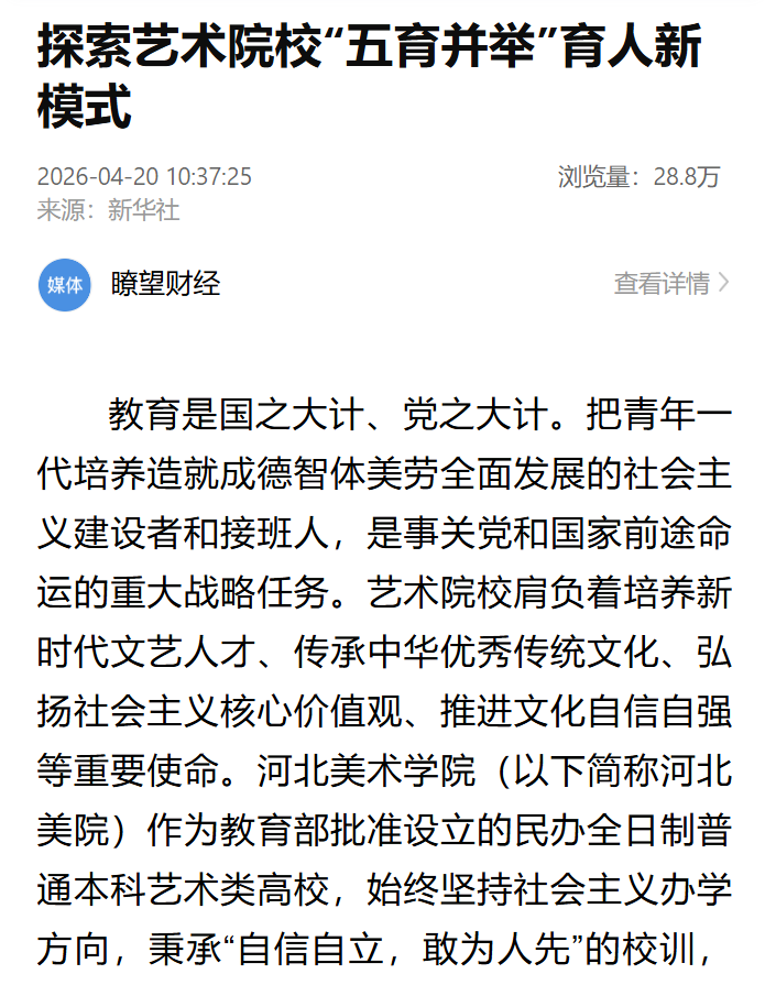教育是国之大计、党之大计。把青年一代培养造就成德智体美劳全面发展的社会主义建设者和接班人,是事关党和国家前途命运的重大战略任务。艺术院校肩负着培养新时代文艺人才、传承中华优秀传统文化、弘扬社会主义核心价值观、推进文化自信自强等重要使命。河北美术学院(以下简称河北美院)作为教育部批准设立的民办全日制普通本科艺术类高校,始终坚持社会主义办学方向,秉承“自信自立,敢为人先”的校训,扎根燕赵文化沃土,深耕艺术教育实践,探索形成了“红色铸魂、卓越立身、大爱筑基、环境浸润、开放赋能”五维一体育人模式。新征程上,河北美院将坚持和加强党的全面领导,牢牢把握立德树人根本任务,以高质量党建引领办学治校各项工作,推动德智体美劳五育并举、深度融合、协同发力,构建“德育铸魂+智育提质+体育强身+美育浸润+劳育赋能”一体化育人新模式,努力走出一条彰显中国特色、突出艺术属性、扎根地方实际、服务国家战略的艺术教育发展之路。