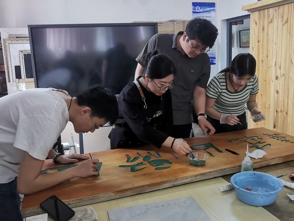 2024年5月,受学校委托,造型艺术学院对仙聚山庄牌匾进行大漆工艺翻新。该项目由美术学教研室承接,由漆画工作室负责人孔老师具体负责,并将该项目引入课堂教学中。她对灰料的使用、擦漆、素髹、打磨与抛光等工艺进行了系统梳理,有力的支持了学校漆画教学的深入探索,同时也为漆画工作室的后期教学与实践应用积累了丰富经验。