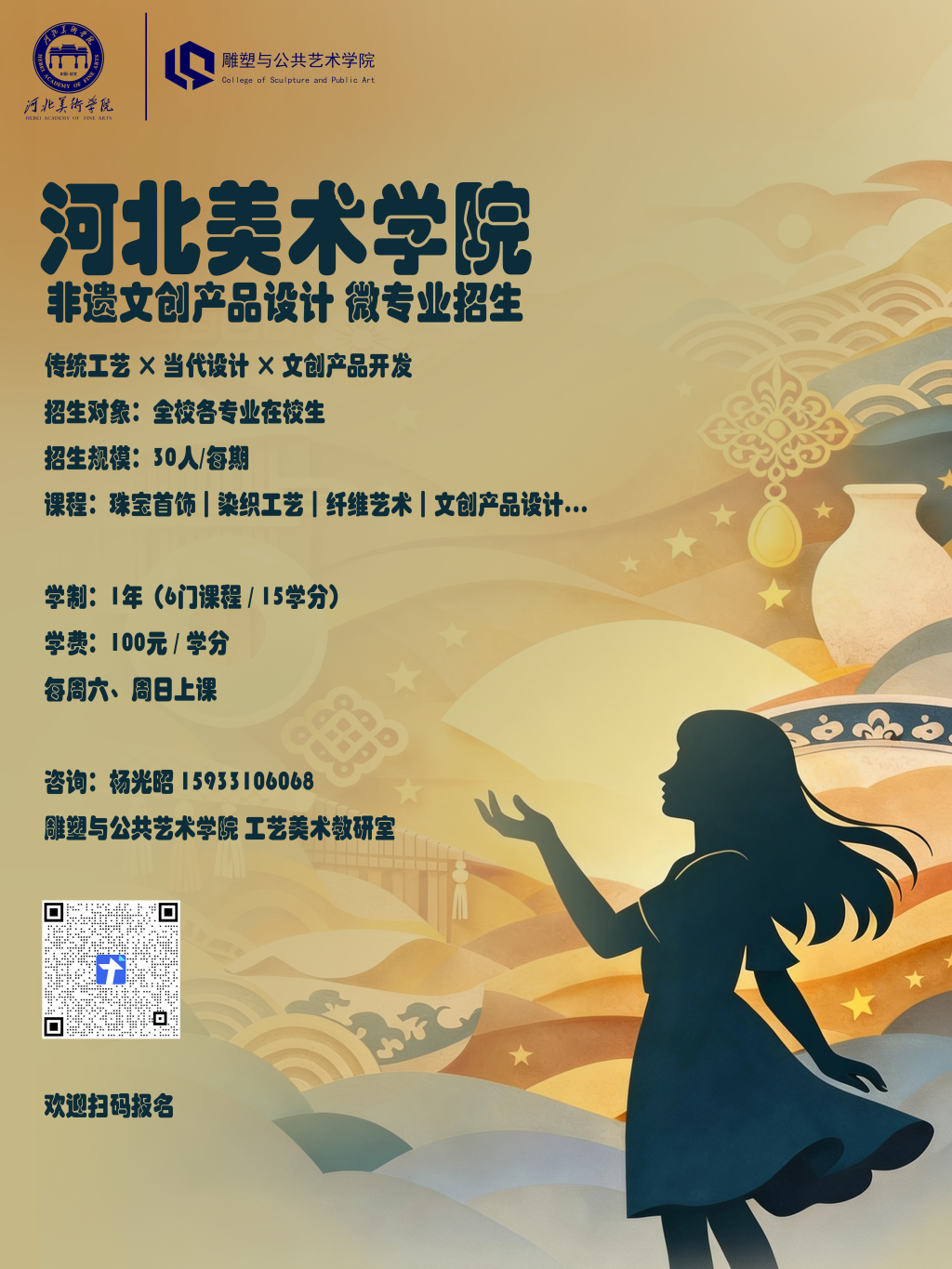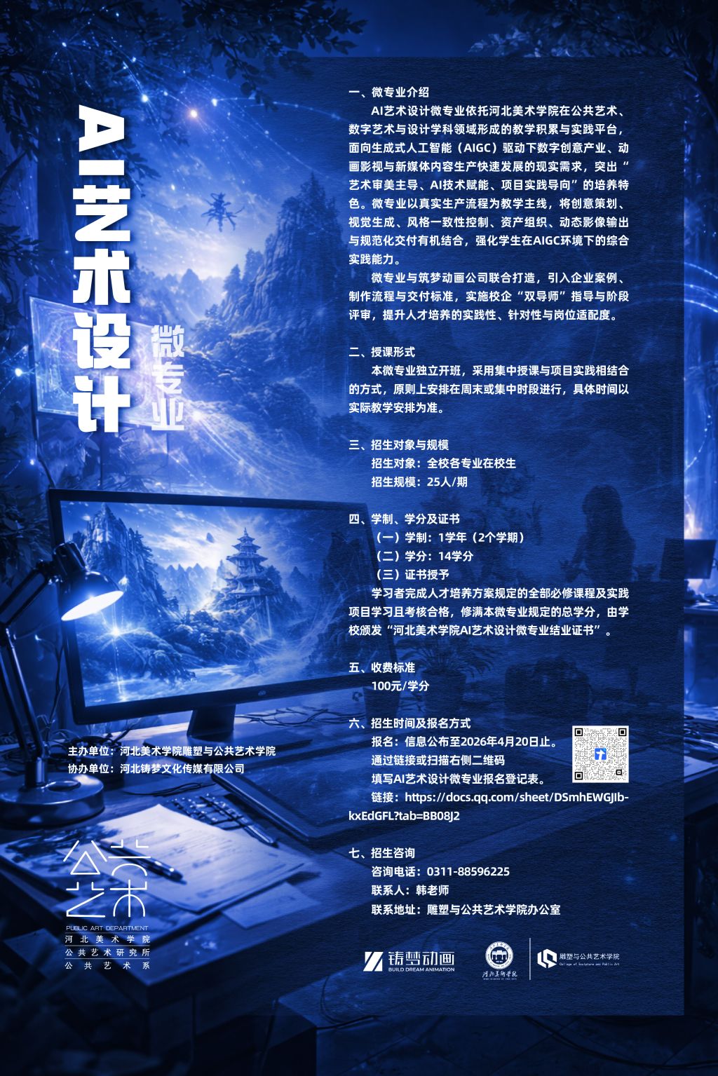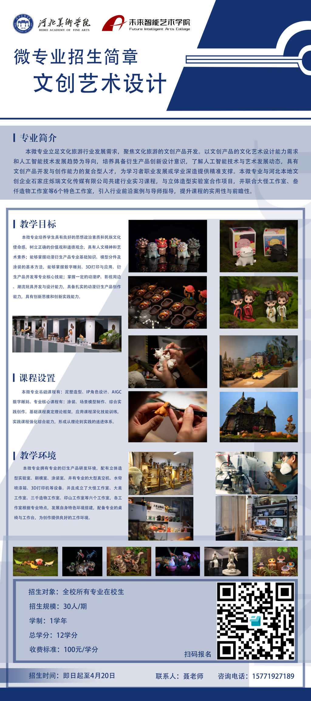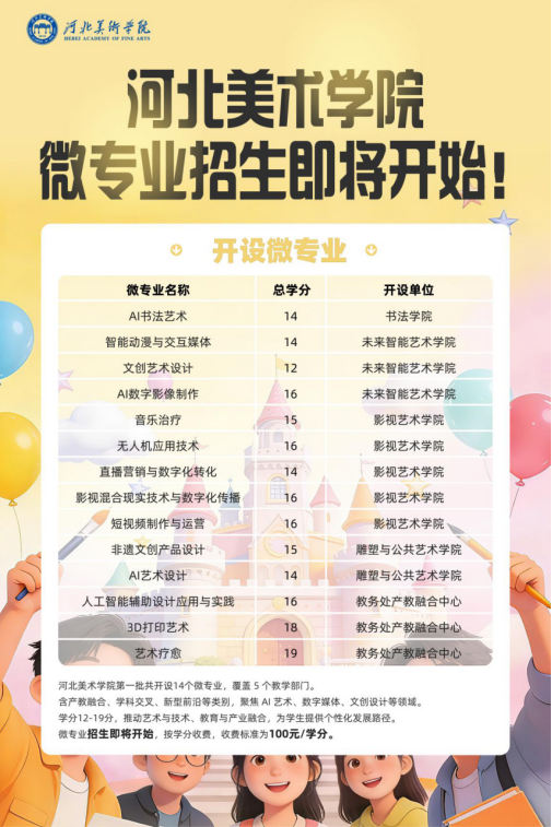 河北美术学院首批14个微专业开始招生啦!覆盖五大教学部门,聚焦AI艺术、数字媒体、文创设计,产教融合赋能成长,助力学生拓宽发展空间、提升就业竞争力。