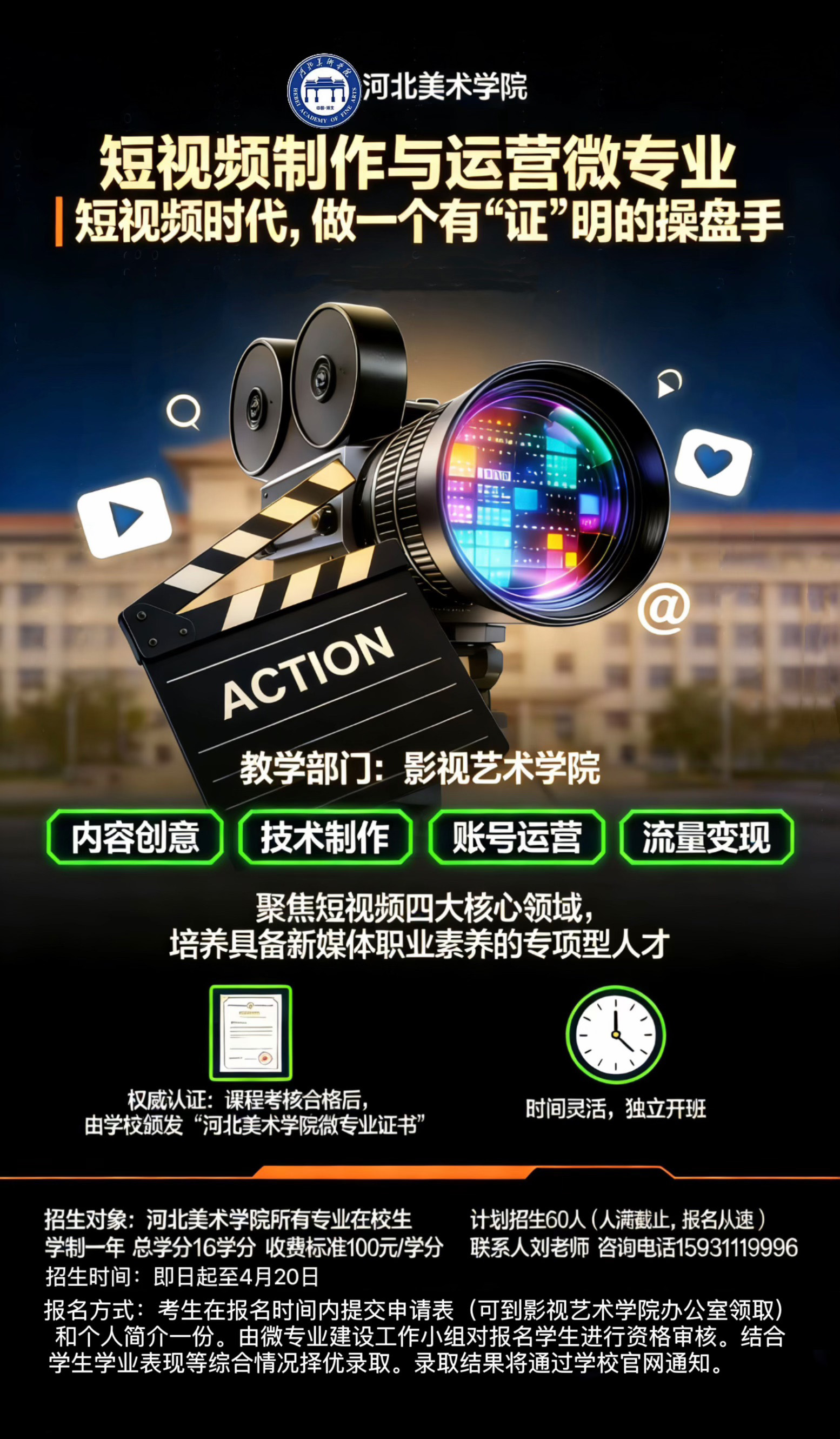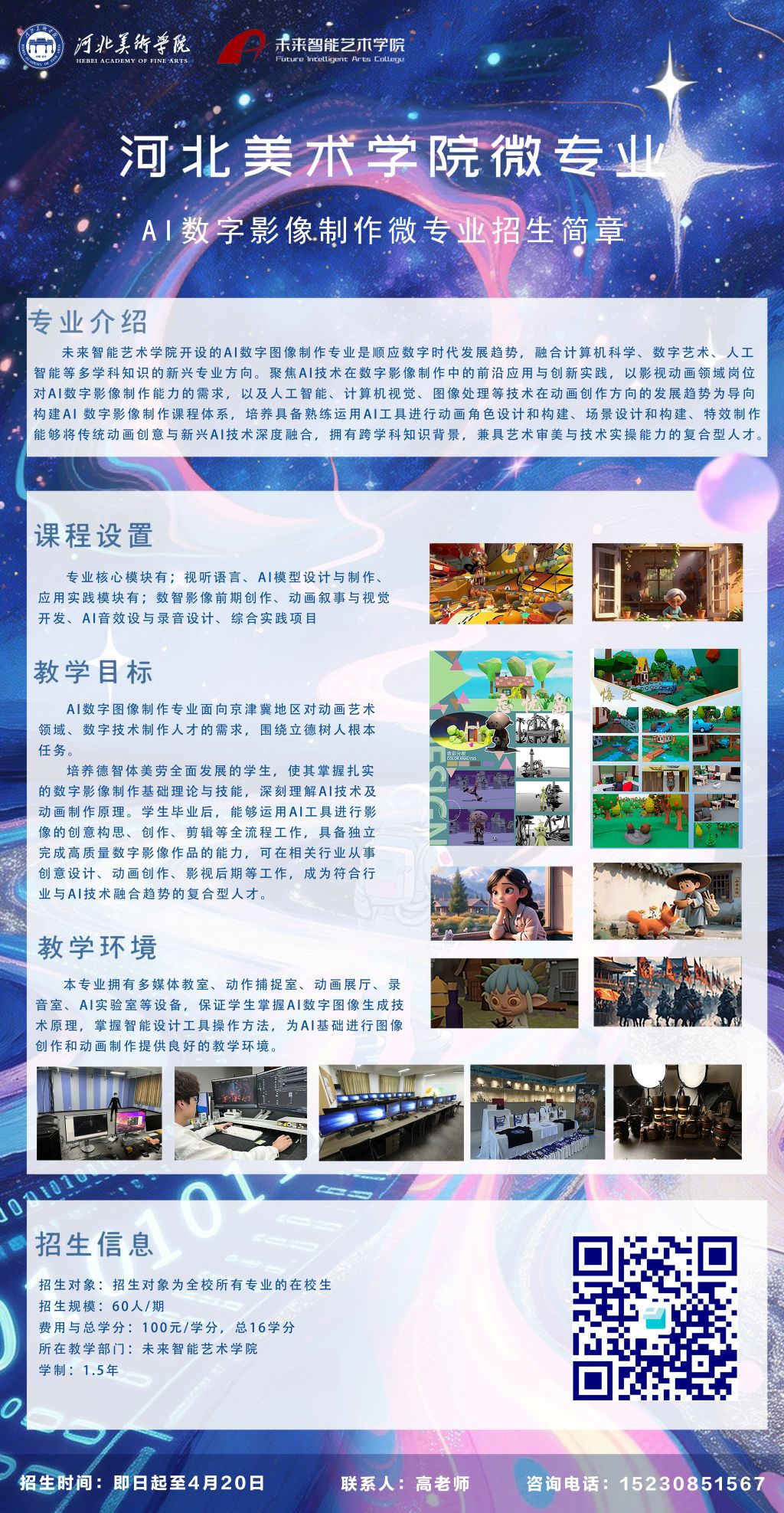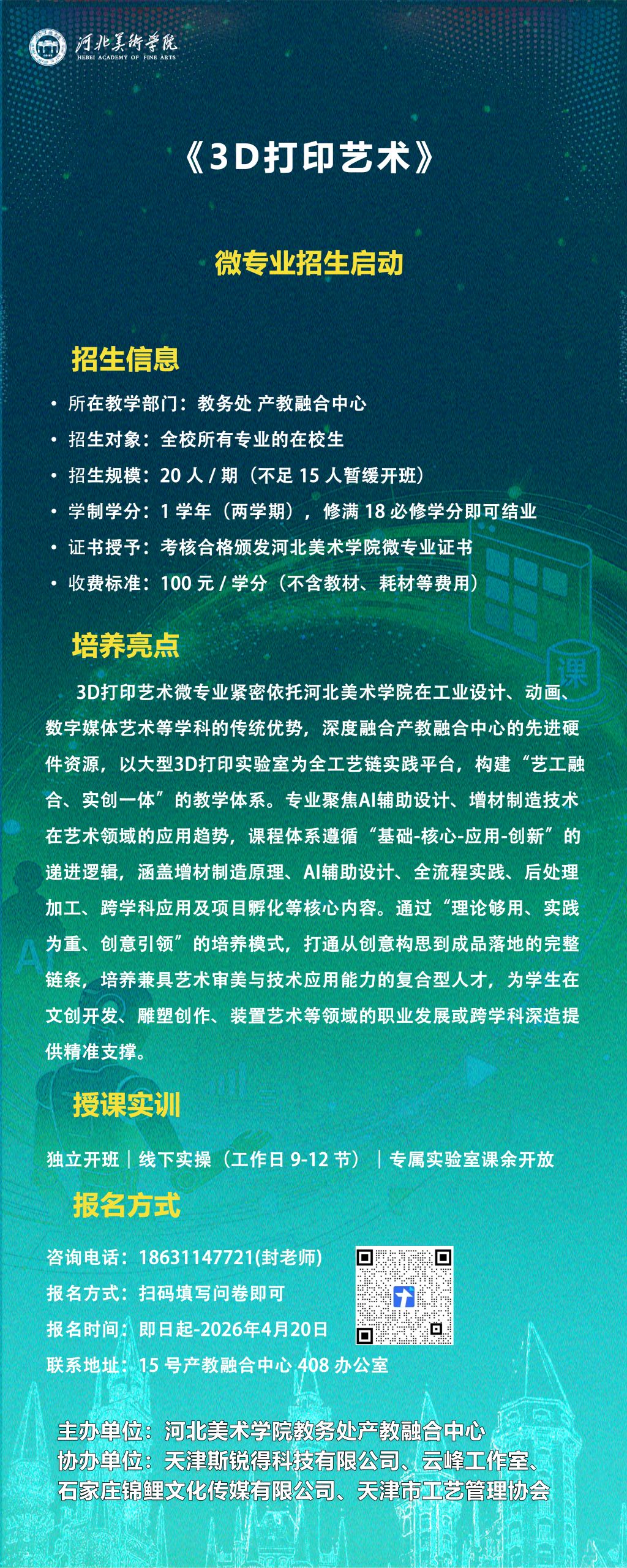 河北美术学院首批14个微专业开始招生啦!覆盖五大教学部门,聚焦AI艺术、数字媒体、文创设计,产教融合赋能成长,助力学生拓宽发展空间、提升就业竞争力。